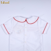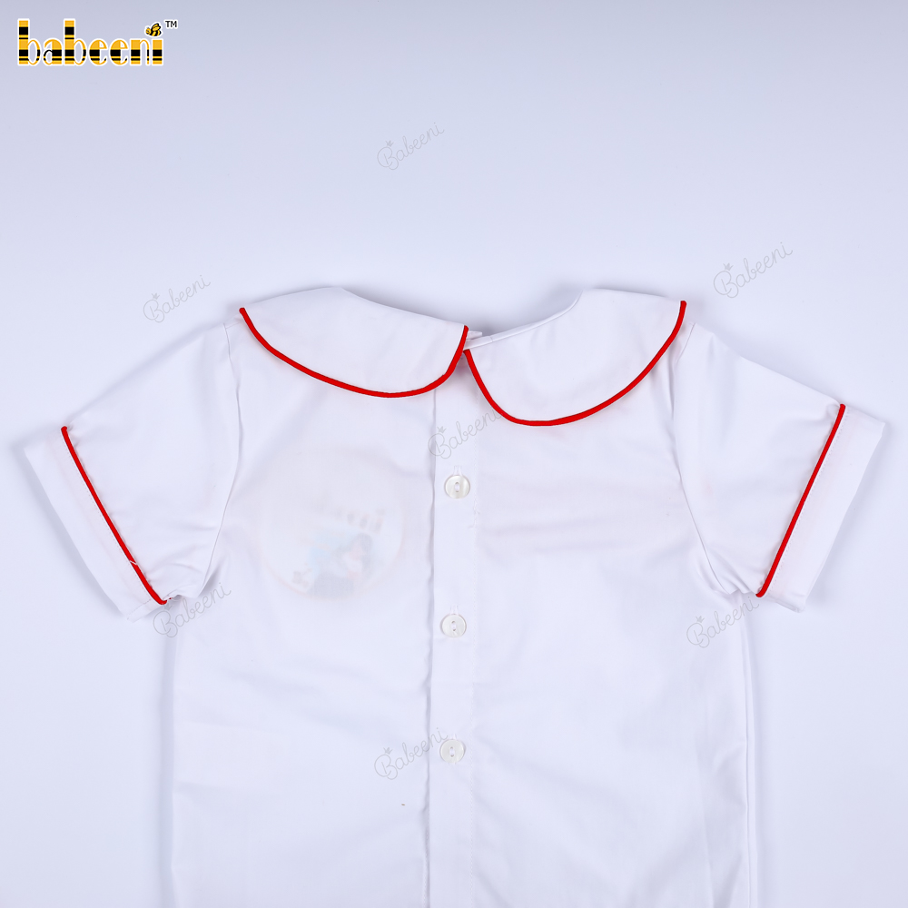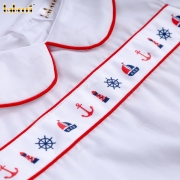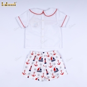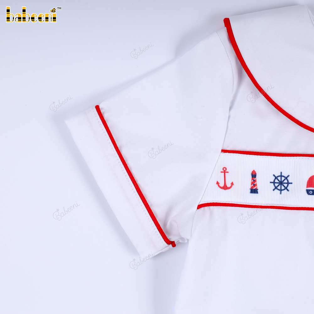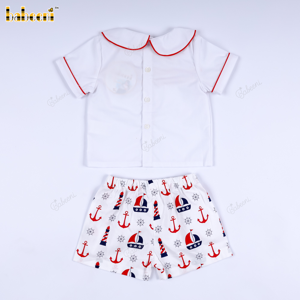 Features: Two-piece set including a white shirt and white pants, with red accents around the sleeves and collar, printed with a lighthouse and anchor design. This outfit will help your little boy stay cool in the summer heat.