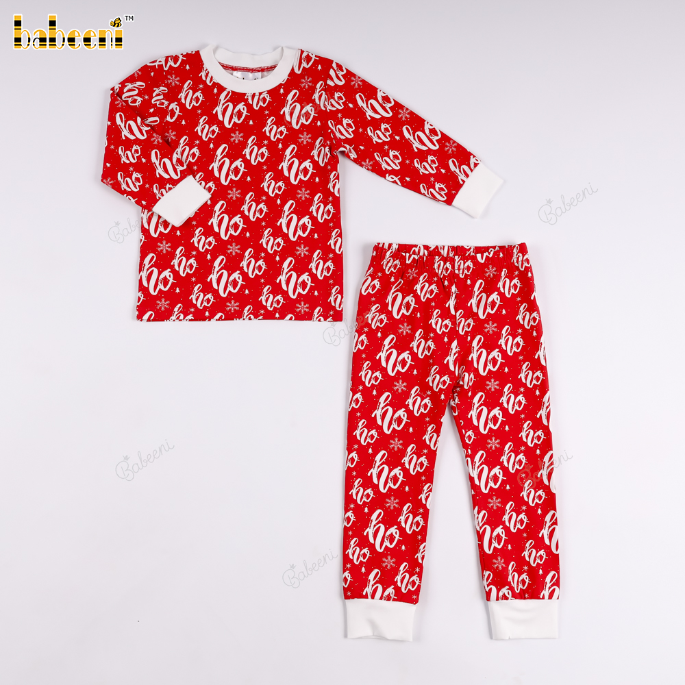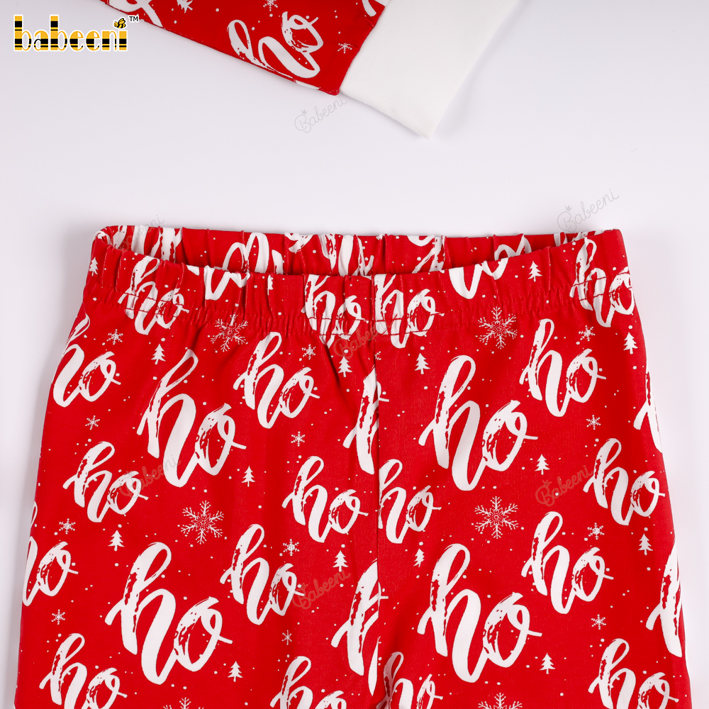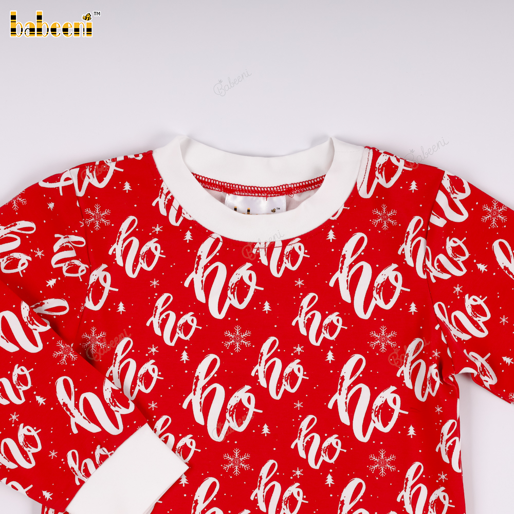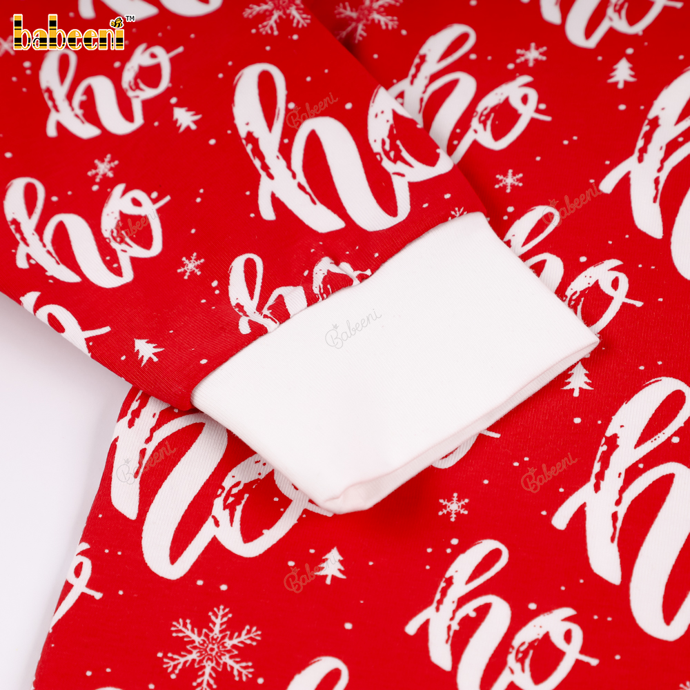 A red outfit with Christmas-themed pants and a hohoho print.– BB3577