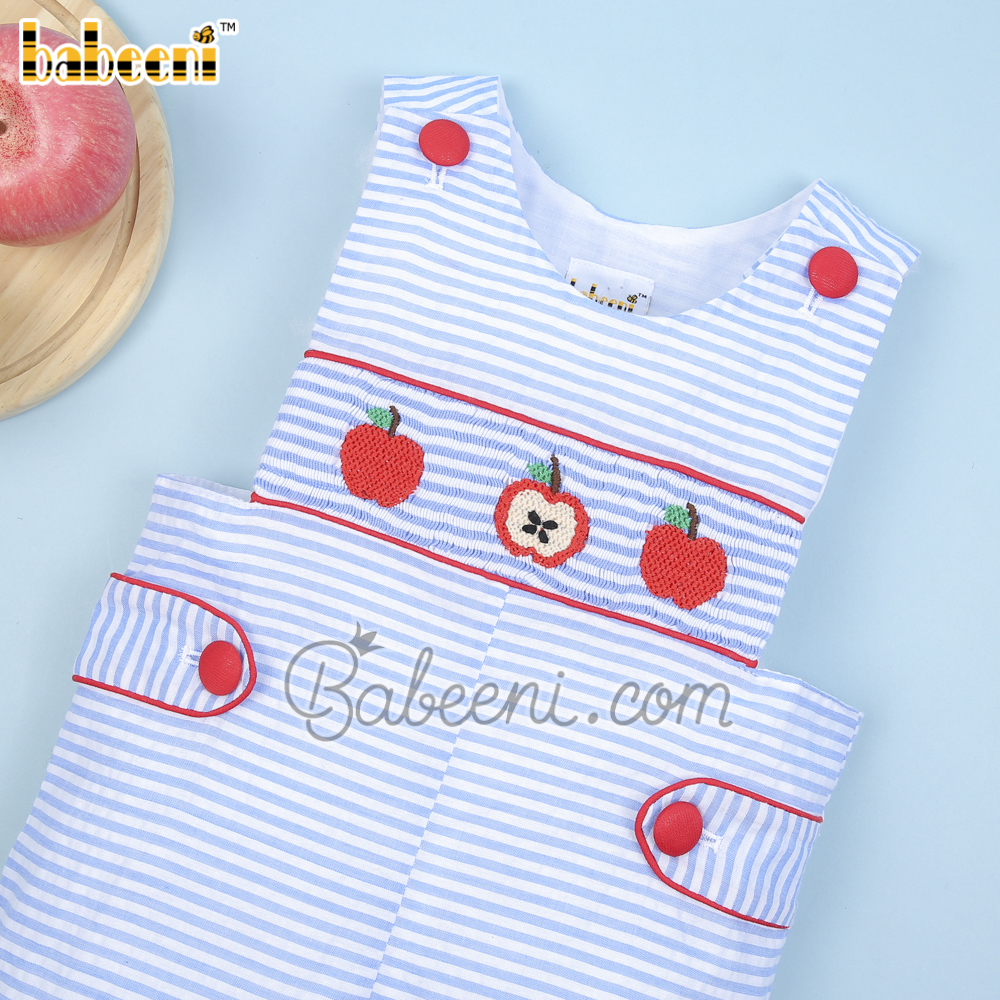 Feature: Cute smocked shortall for back to school occasion with apples smocked pattern on the bodice, side tabs, shoulder buttons, snap at crotch