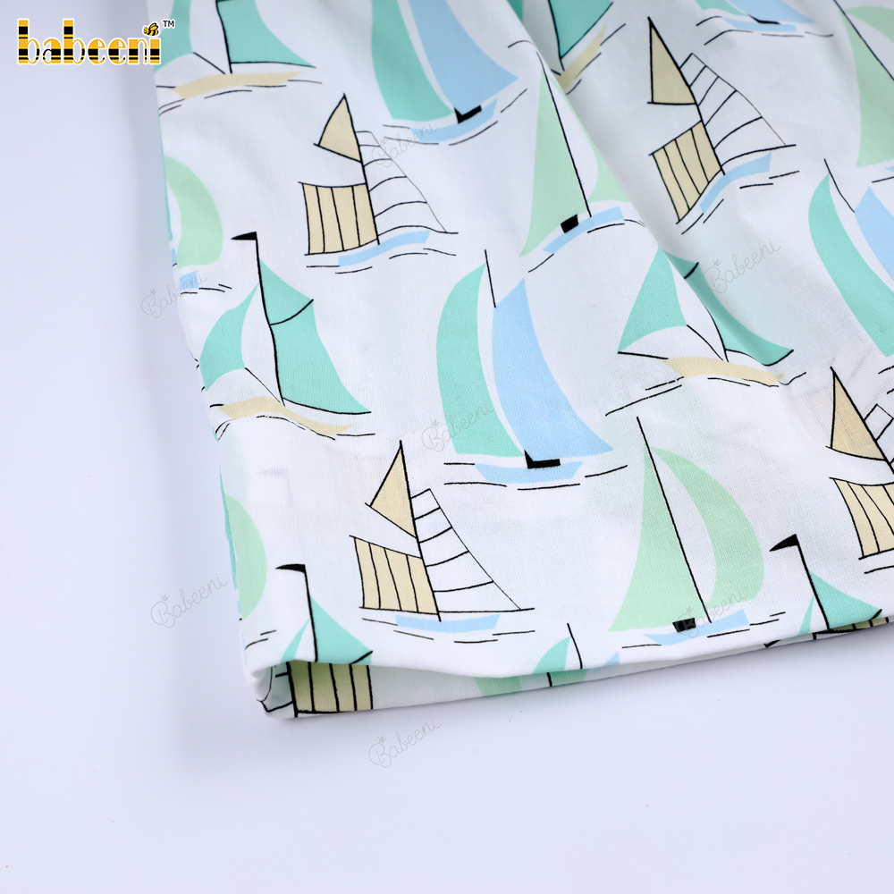 Material: 4.0 Fabric printed with sailboat pattern + Blue color + Embroidered sailboat on the collar
