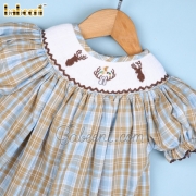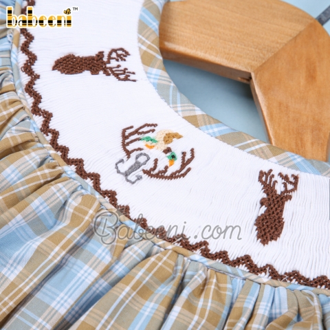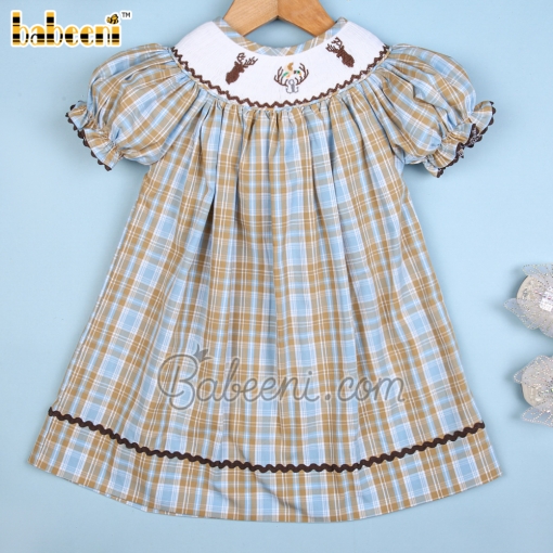 Feature: Baby girls smocked bishop featured with cute reindeers and mallard smocked pattern around the neck. Back buttons for easy dressing, zigzag at hem