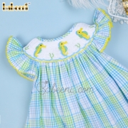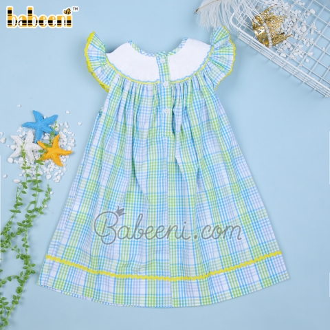 Feature: Beautiful smocked bishop dress for little girl with seahorse hand smocked patterns on the neck, short sleeves.