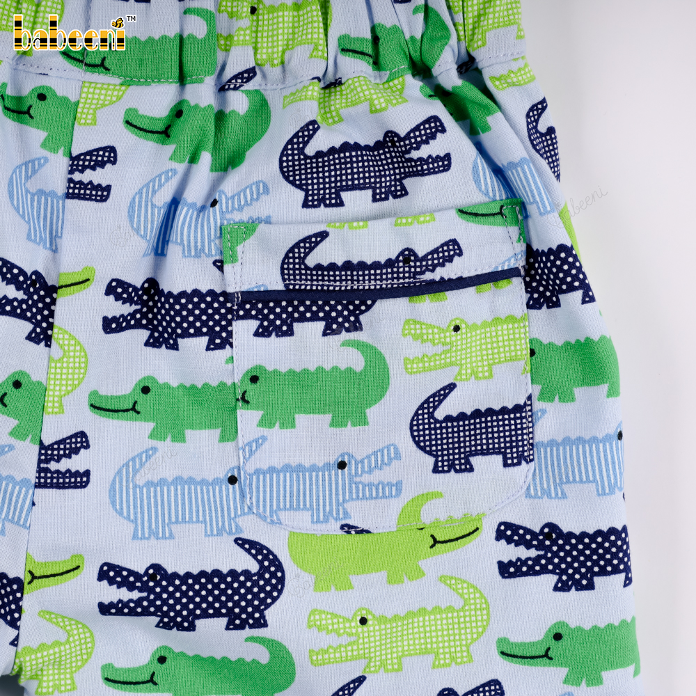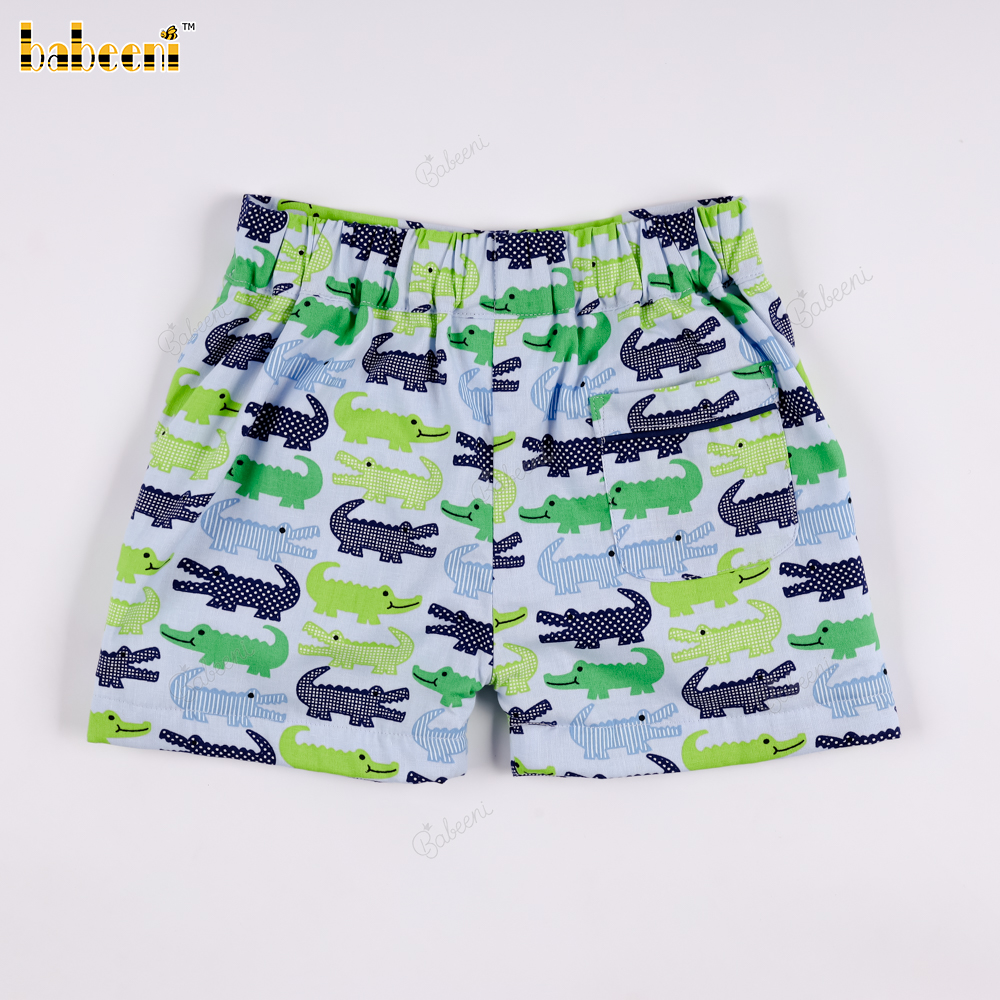Feature: Boys' shorts featuring a fun crocodile print in a variety of bright green and blue colors. Designed with two convenient side pockets, these shorts create a dynamic, youthful, and vibrant style. Perfect for hot summer days, strolling around town, playing, or participating in outdoor activities.