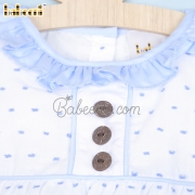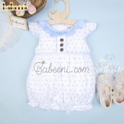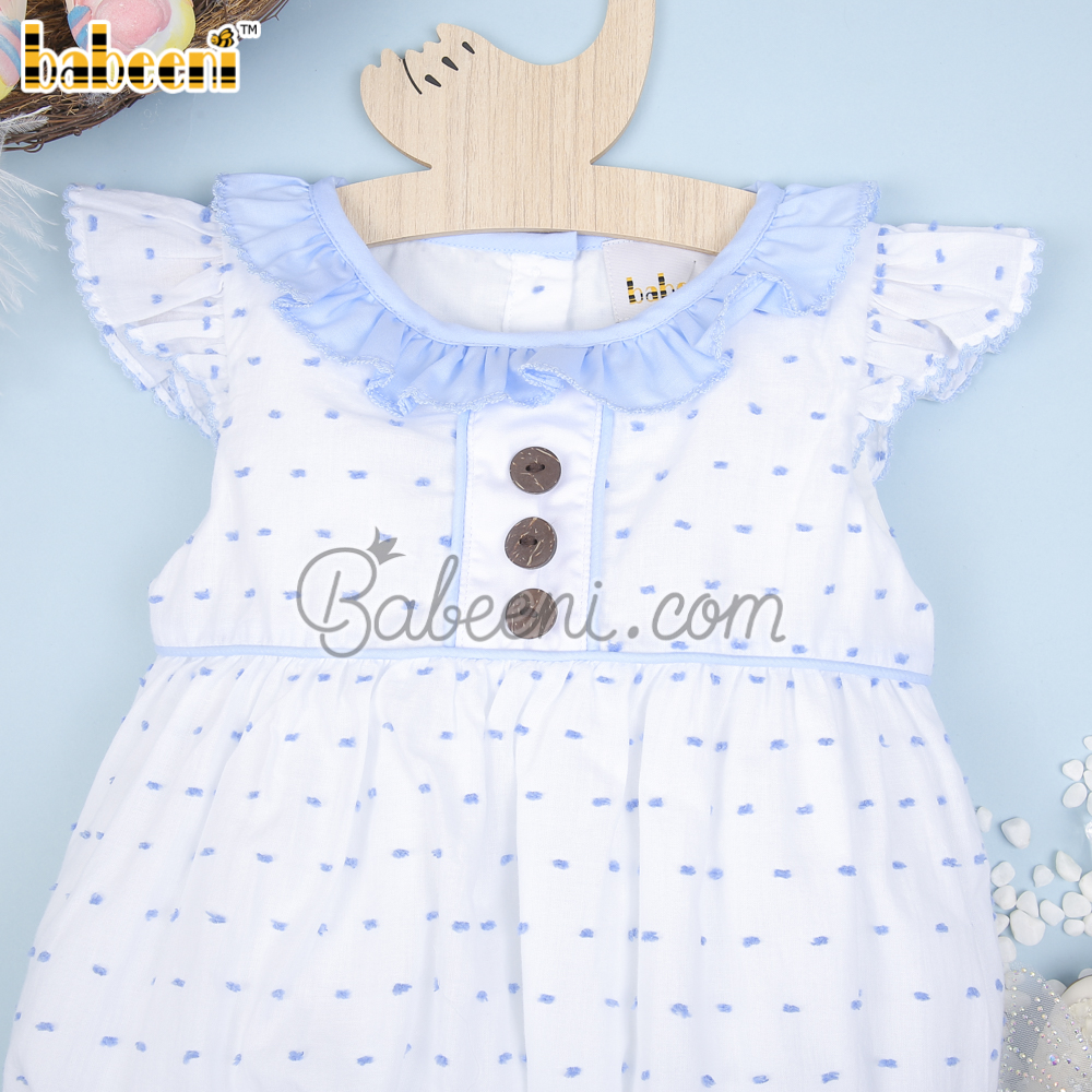 Feature: Cute bubble for baby girl. The bubble has round neck with ruffle, angle-sleeves and back buttons.  More outstanding with wooden button on the front and crotch snaps for easy dressing. Best gifts for birthday or special occasions.