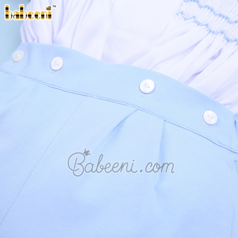 Feature: Boy geometric smocked set with geometric embroidery patterns on the chest. Buttons on back for easy dressing. Perfect combination between pattern & fabric.