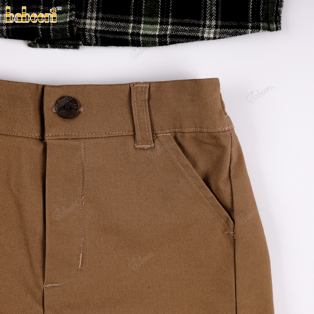 Boys' checkered flannel shirt in blue and black, and brown khaki shorts set.- BB3561