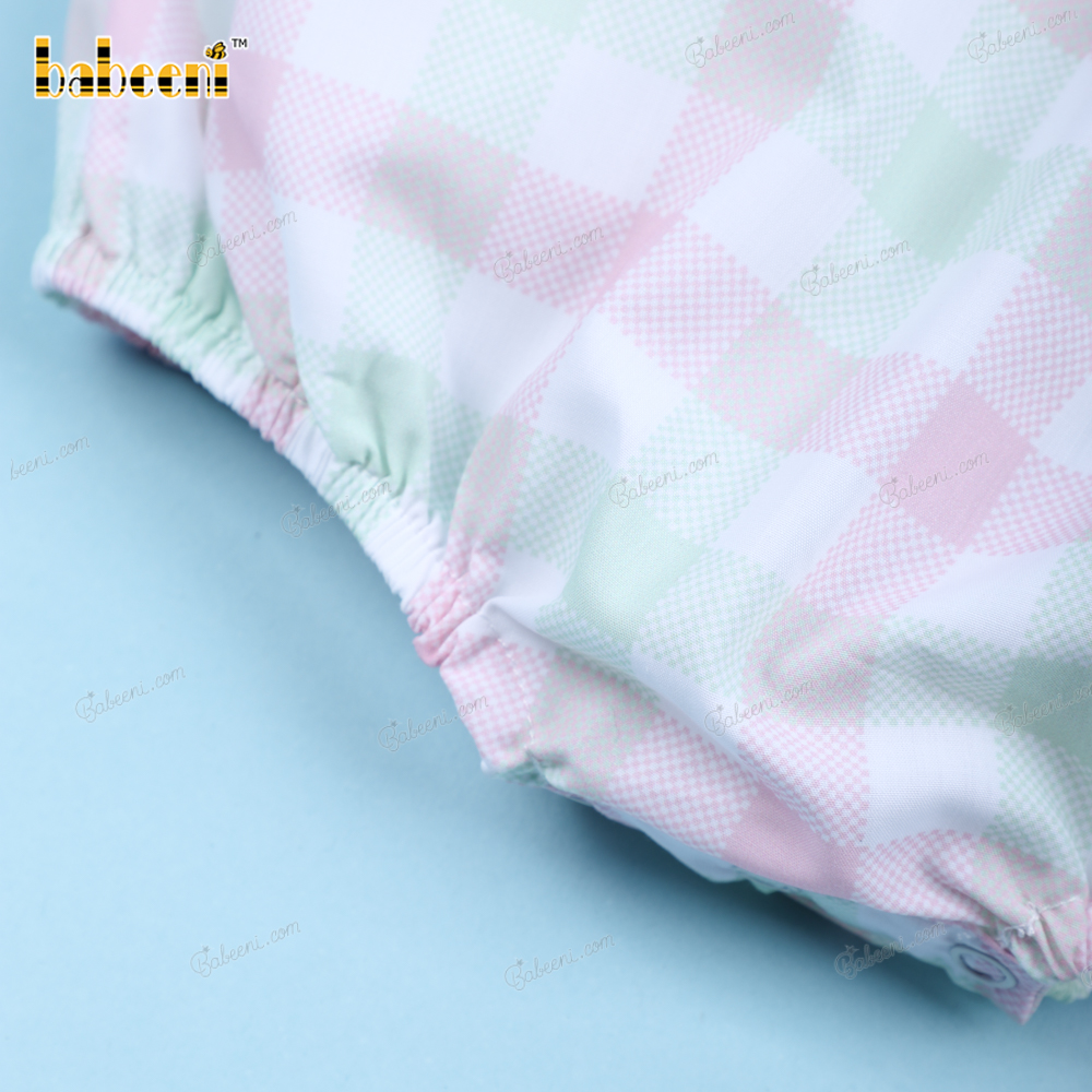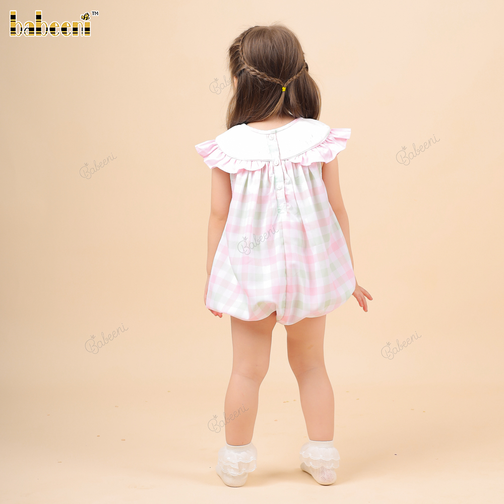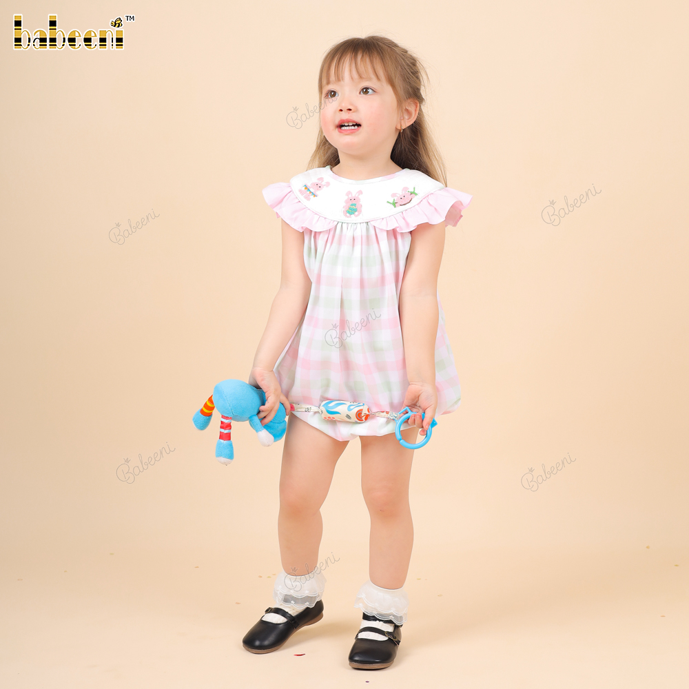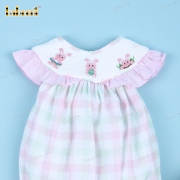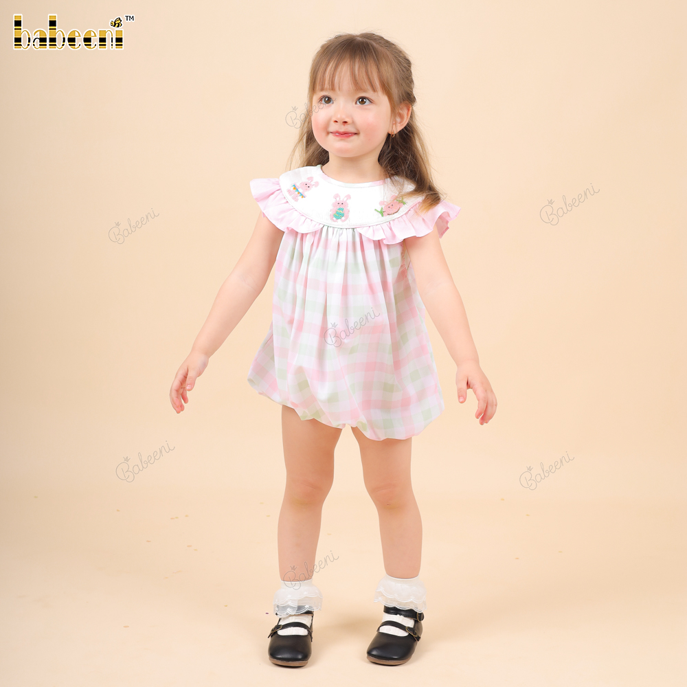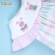 Feature: This bubble dress is in a lovely pink with three bunnies smocked on the front neck. This is a perfect gift for your girl this Easter season.