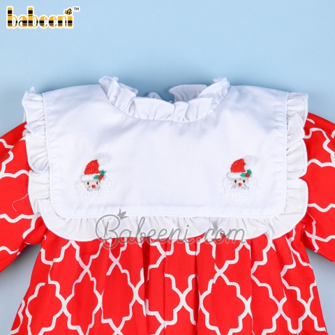 Feature:Pretty long bubble for baby girl with Santa Claus hand embroidery patterns on large square neck. Long sleeves. Back buttons. Crotch snaps.