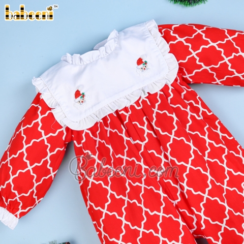 Feature:Pretty long bubble for baby girl with Santa Claus hand embroidery patterns on large square neck. Long sleeves. Back buttons. Crotch snaps.