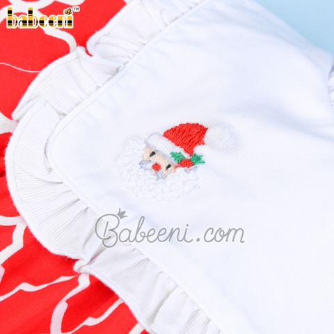 Feature:Pretty long bubble for baby girl with Santa Claus hand embroidery patterns on large square neck. Long sleeves. Back buttons. Crotch snaps.