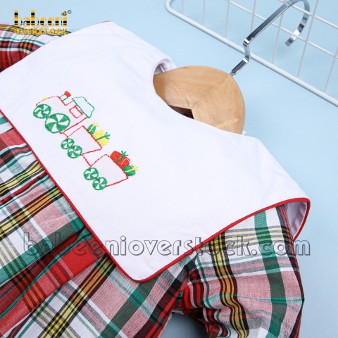 Feature: Nice long bubble for little boy on Christmas with gift train hand embroidery patterns on the large square collar, long sleeves.