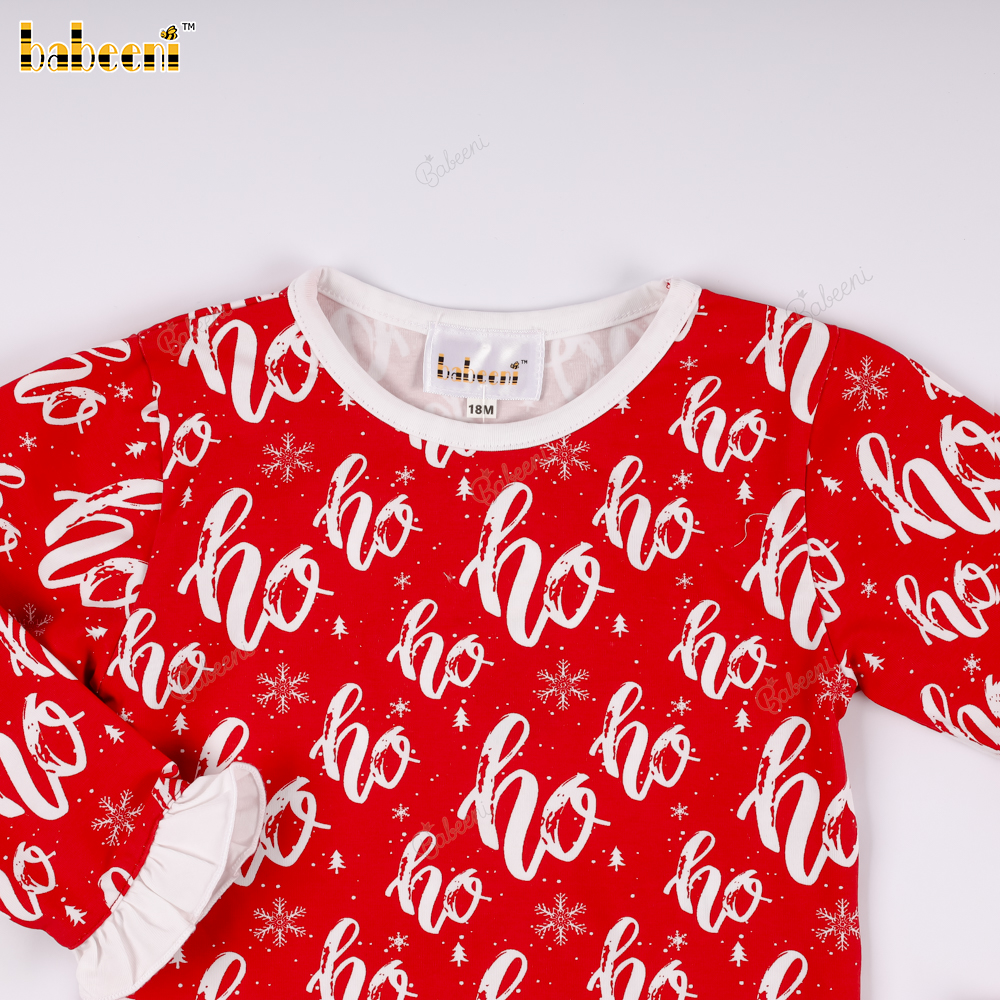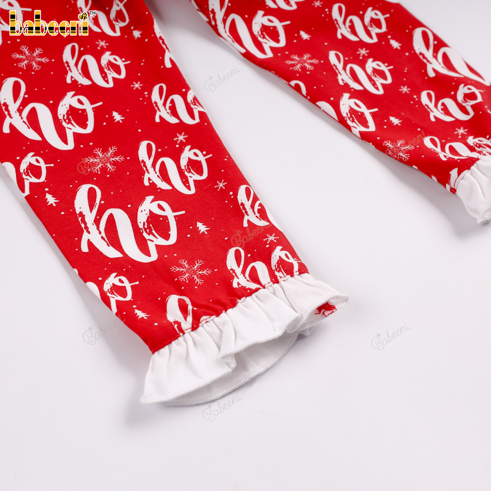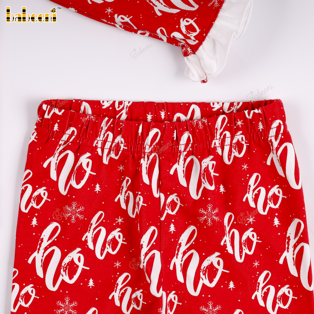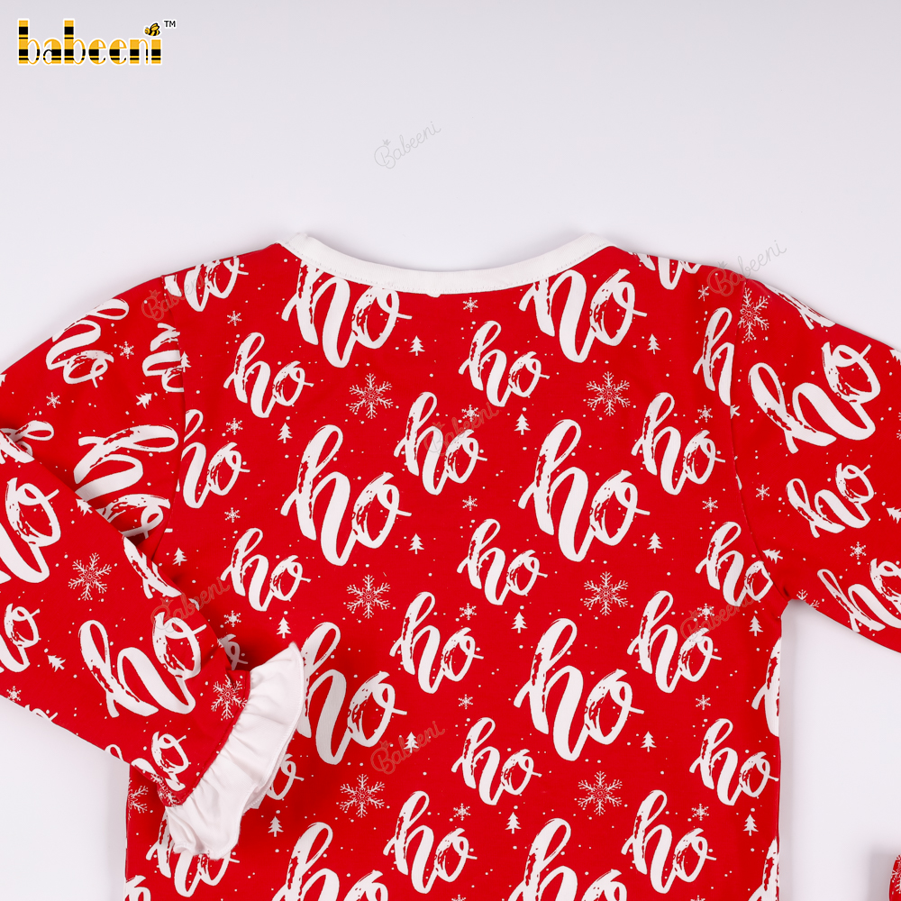 Christmas set with "Ho Ho Ho" pattern and ruffled trim..– BB3580