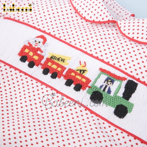 Features: Nice smocked set clothing for little boys with hand Christmas train on the chest, red piping on collar & sleeves. Perfect for Christmas. Best gifts for birthday or special days.