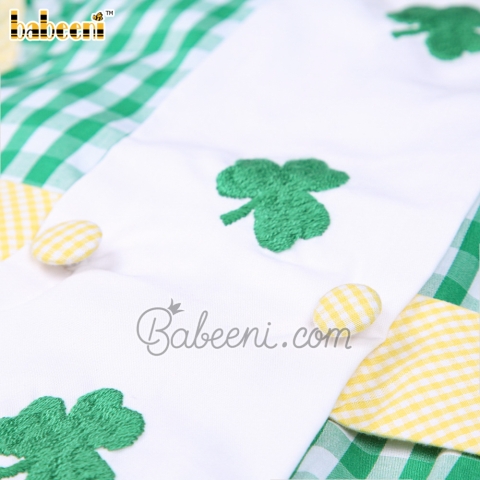 Feature: Girl dress for St. Patrick with clovers hand-embroidered pattern in the front, belt with buttons