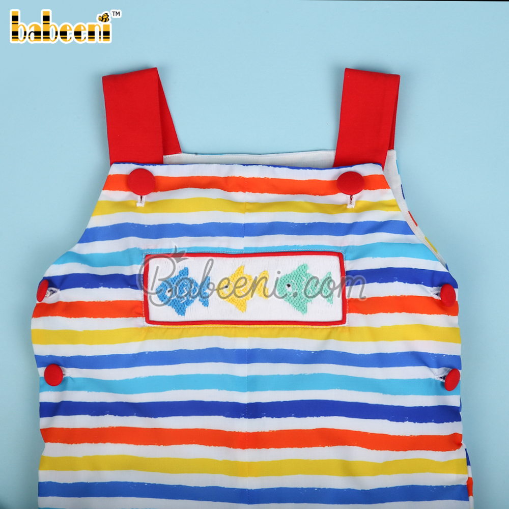 Feature: Nice shortall for little boys with hand smocked fish on the chest, covered button. Perfect for Spring summer. Best gifts for birthday or special days.