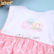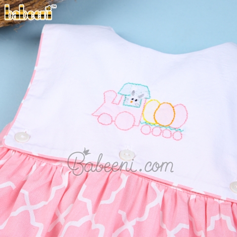 Feature: Lovely girl dress for Easter occasion with Bunny eggs train shadow embroidery pattern on large white rectangle bib, back buttons