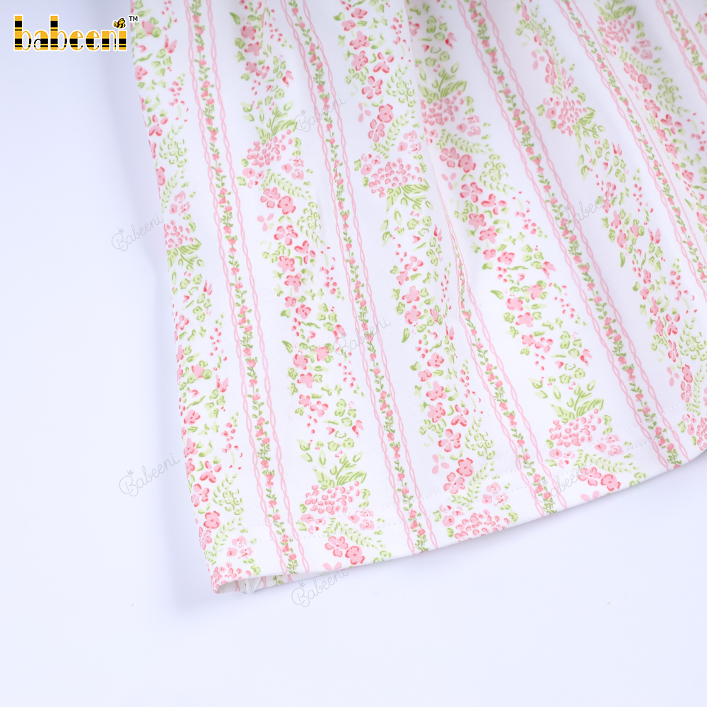 Material: Light pink fabric with pink striped floral print, eco-friendly, with white border and floral pattern.