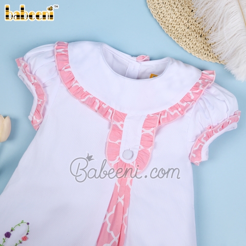 Feature: Beautiful A-line dress for little girl flowers embroidered front down patterns, short sleeves, ruffles on neck and top of sleeves. The dress' exquisite twist is pleat detail running along the body