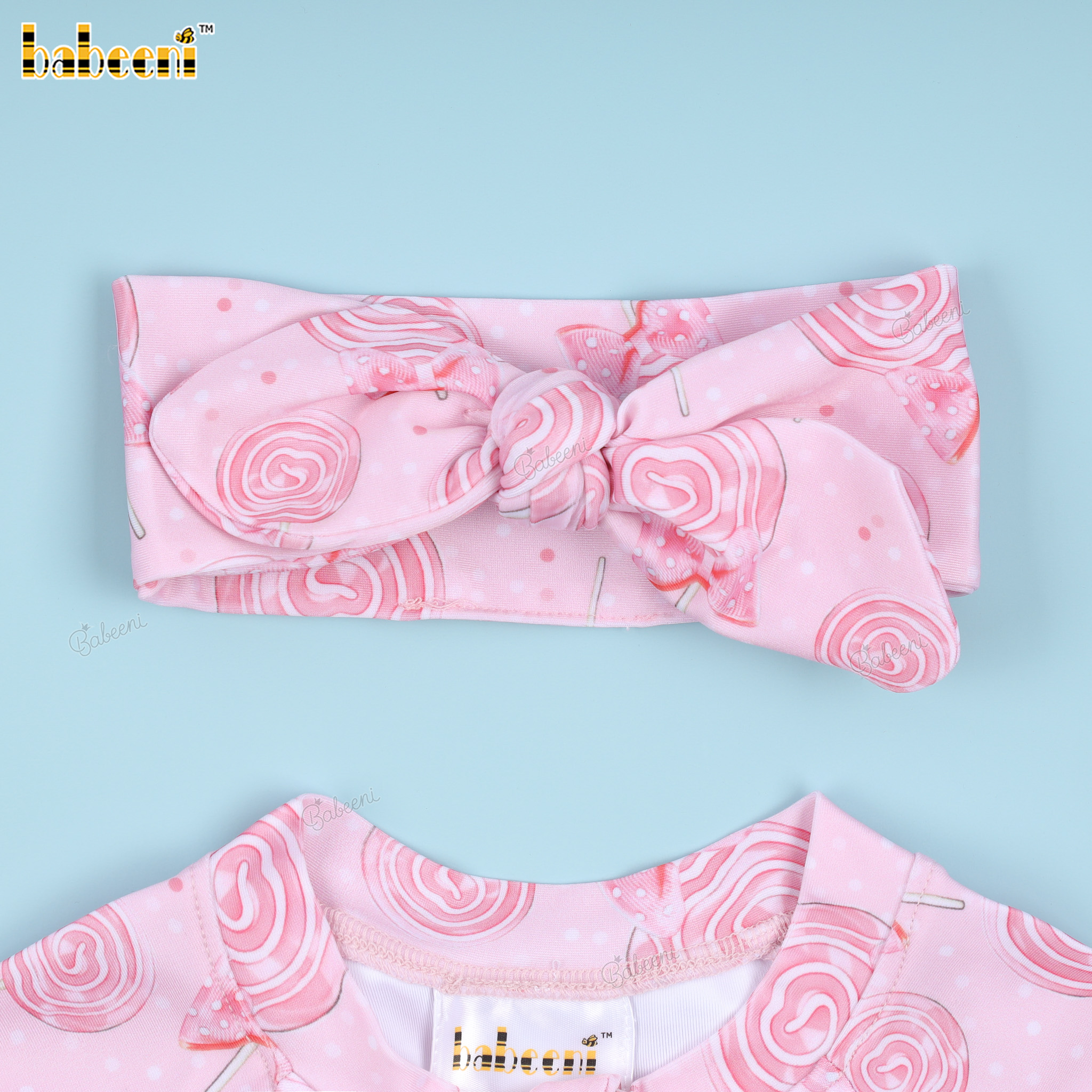 Fancy Pink Swimwear with bow tie and sweet candy pattern For Girl - BB3432B