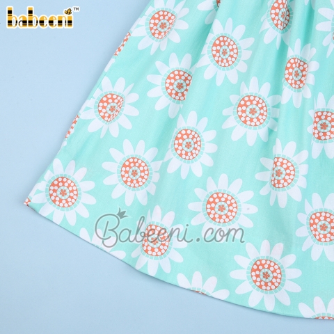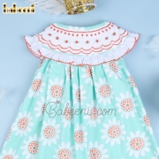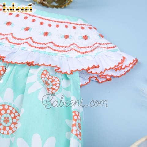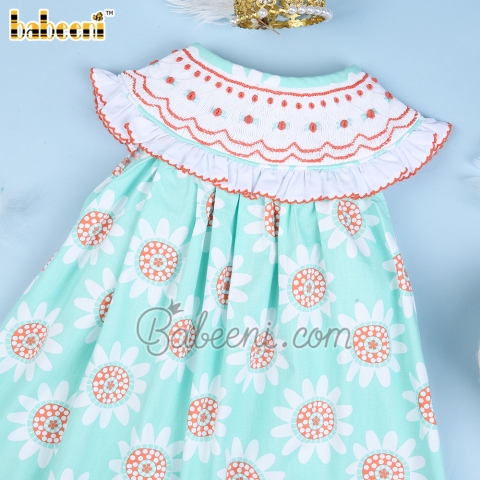 Feature: Lovely smocked diaper with floral geometric smocking the collar embellished white ruffle, coral sunflower printed on fabric. Perfect for Spring summer. Best gifts for birthday or special days.
