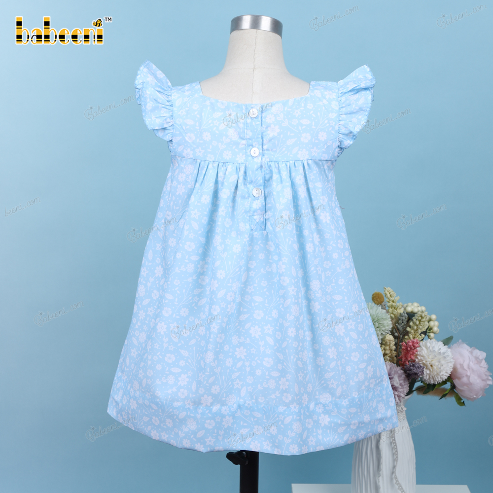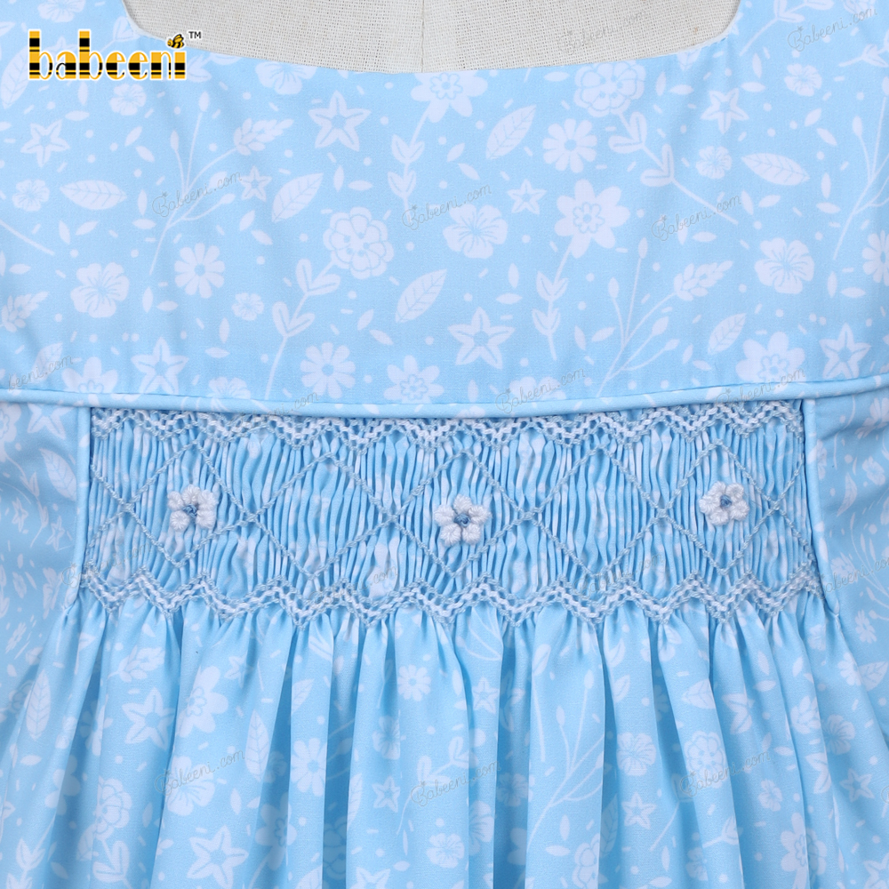 Feature: Gorgeous smock dress for your girl in white with blue floral pattern and flower hand embroidery on the chest.