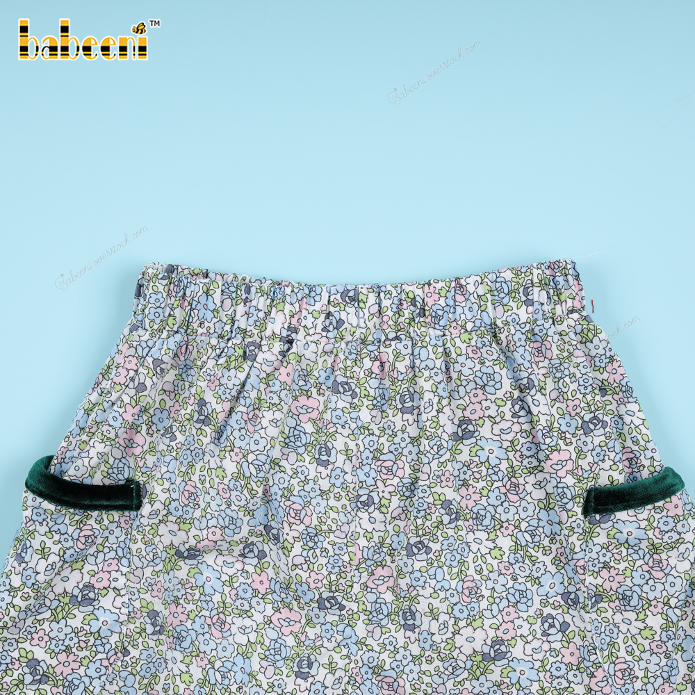Material: tiny blue and pink floral fabric + green velvet