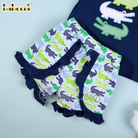 Feature: Beautiful girl set with appliqued crocodiles on the chest, puff sleeves, embellished with lovely ruffle on sleeves. Shorts are decorated with ruffles across the front side.