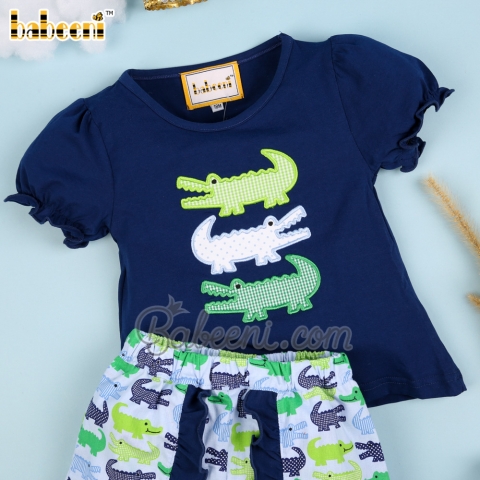 Girl set with appliqued crocodile navy top printed shorts - BB2249A