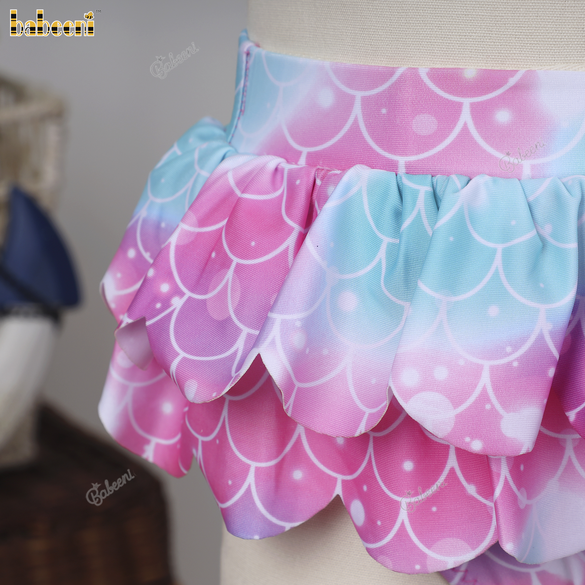 Feature: Cute two-piece bathing suit for girls with fish scales pattern, appliqued top.