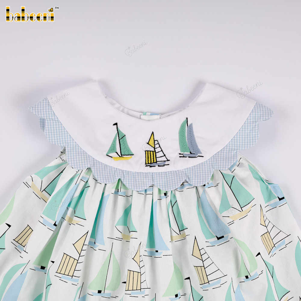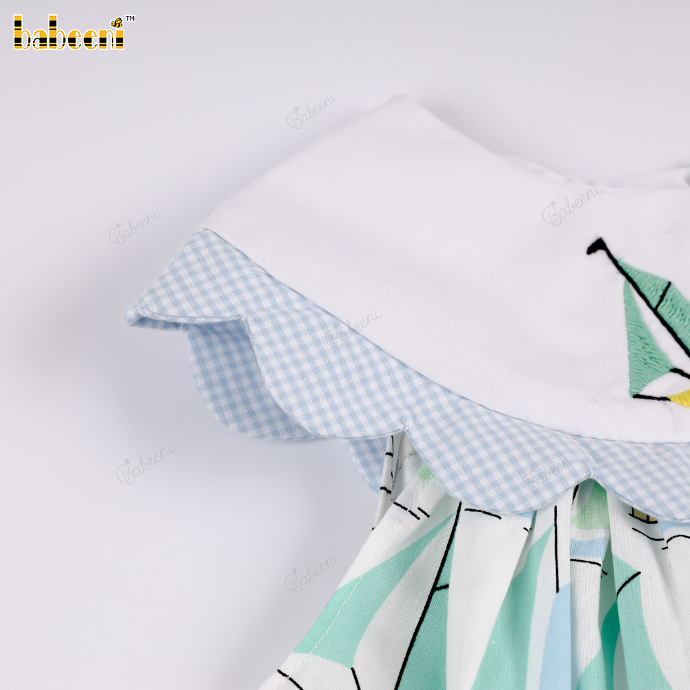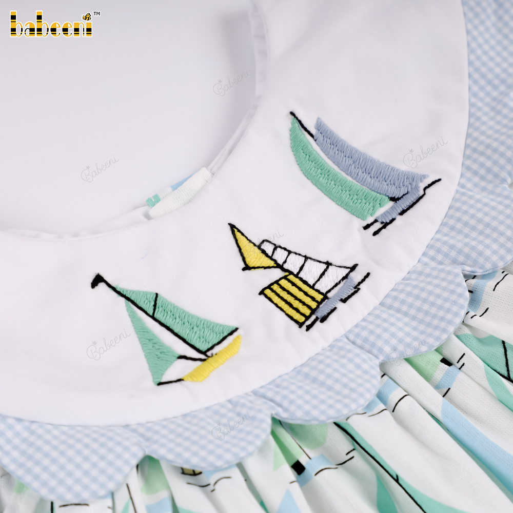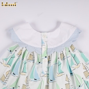 Material: 4.0 Fabric printed with sailboat pattern + Blue color + Embroidered sailboat on the collar