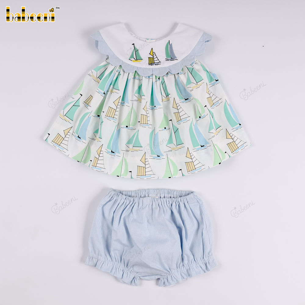 Girls' outfit set with sailboat print and blue bloomer pants.- BB3559