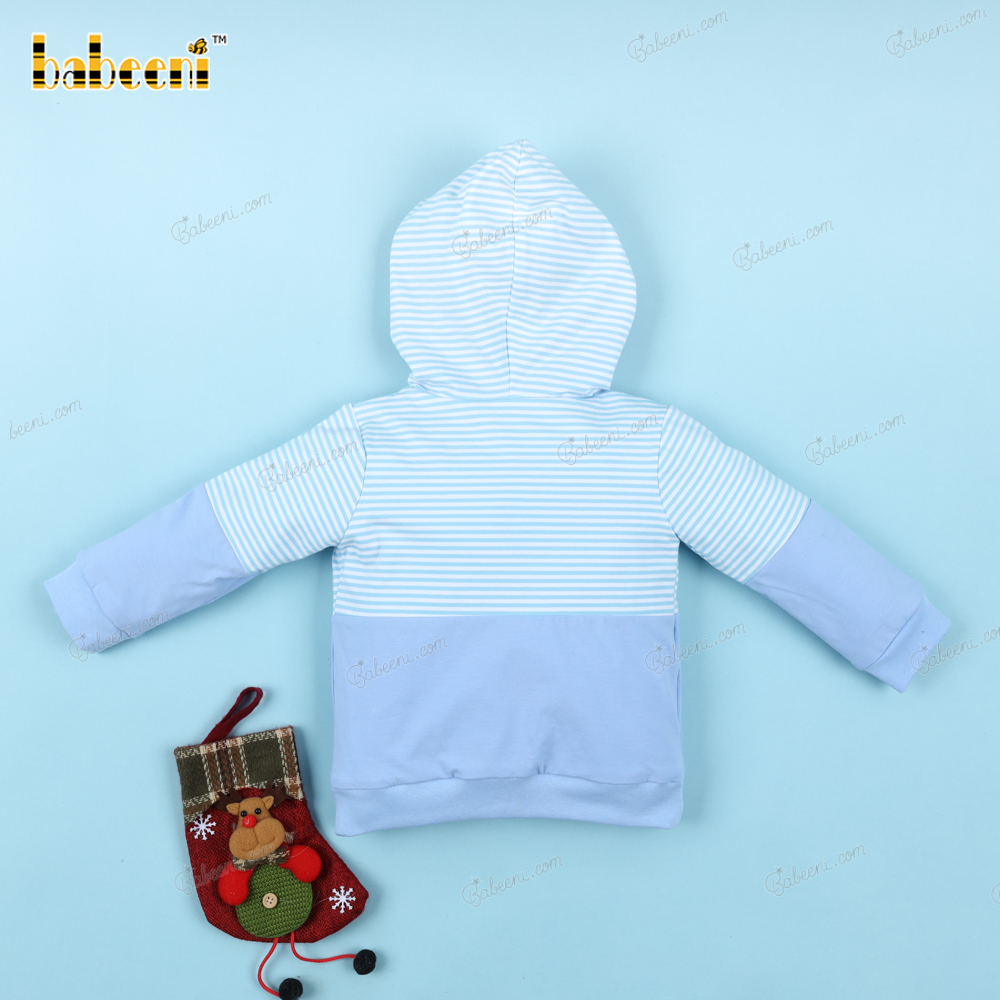 Feature: This hoodie is made out of knit fabric both safety for children. Blue horizontal stripes and blue sleeves with a tiny Santa image French knot on the right chest.