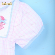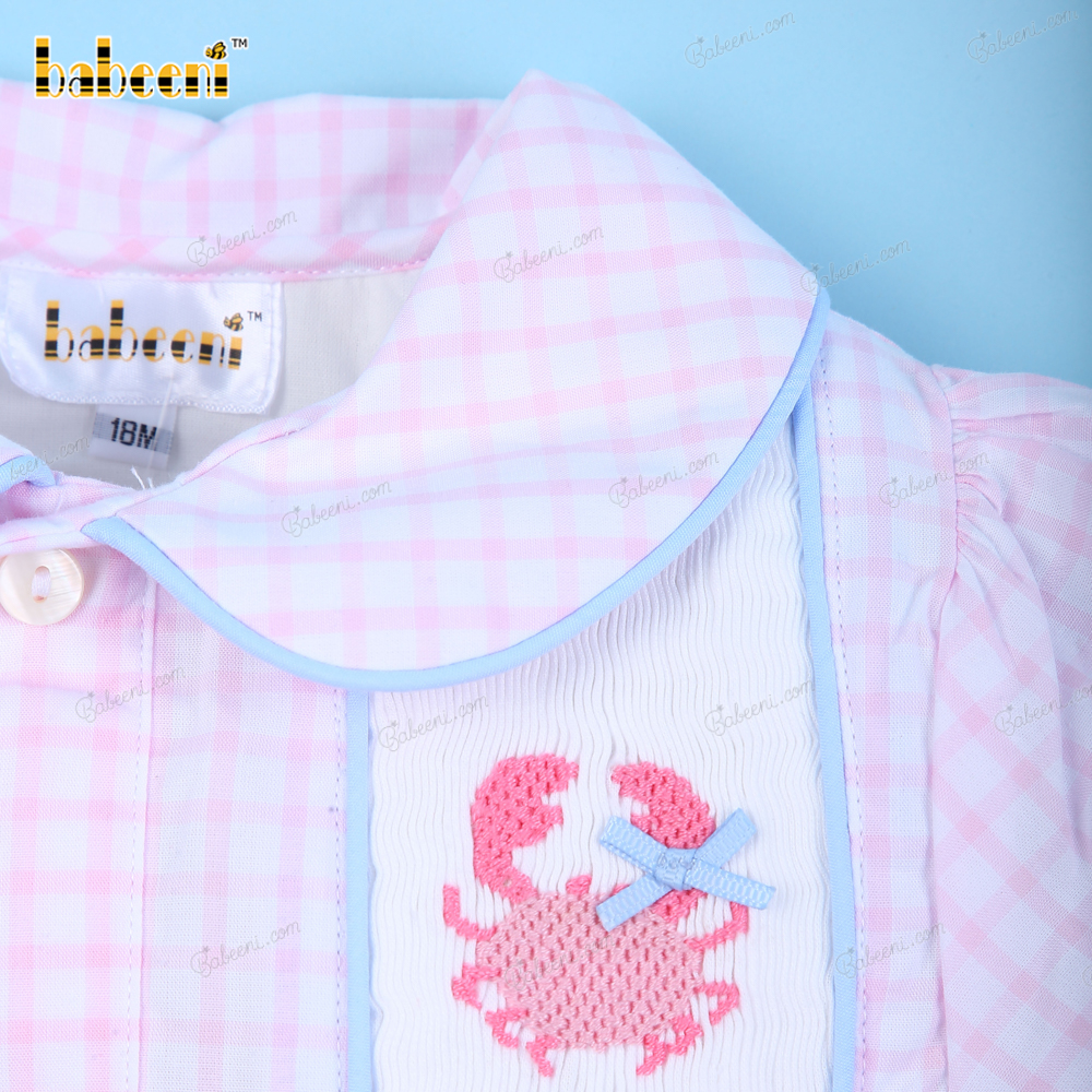 Feature: Beautiful baby bubble with crab hand-smocked patterns, short sleeves SS 2023 for girl collection. Perfect for summer and spring days.