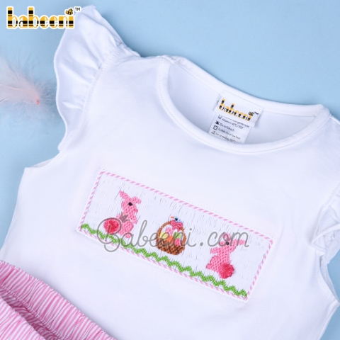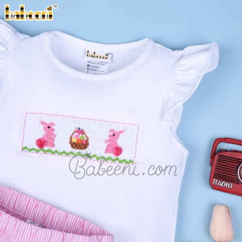 Feature: Lovely girl smocked short set with bunny & eggs basket smocked pattern on chest, round neck, angel sleeves, ruffle shorts