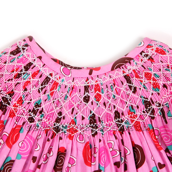 Feature: Beautiful girl dress in bishop style with geometric smocked patterns on the neck, short sleeves.