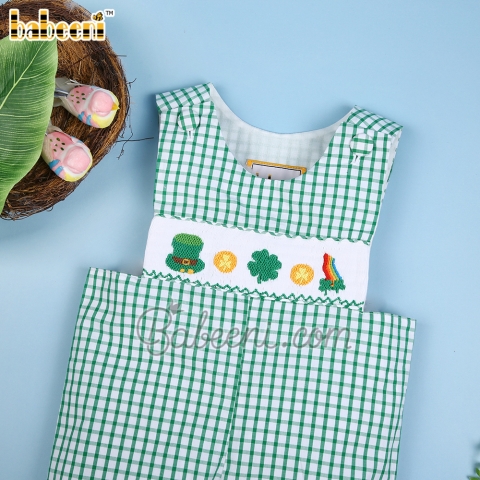 Feature: Lovely baby boy longall with St. Patrick day icons hand smocked pattern on the bodice, shoulder buttons, crotch snaps down to the stripe.