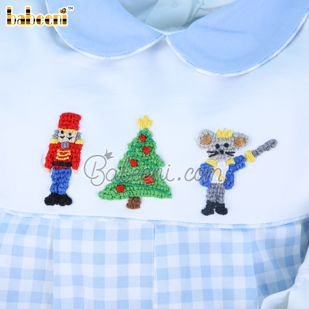 Features: White and baby blue gingham boy bubble, hand crochet Christmas characters, Peter pan collar, gingham hemline, long sleeves. Perfect for Chrismast. Best gifts for birthdays or special days.