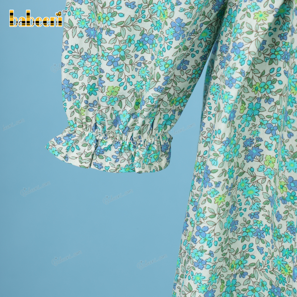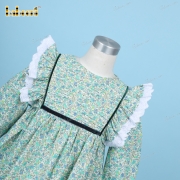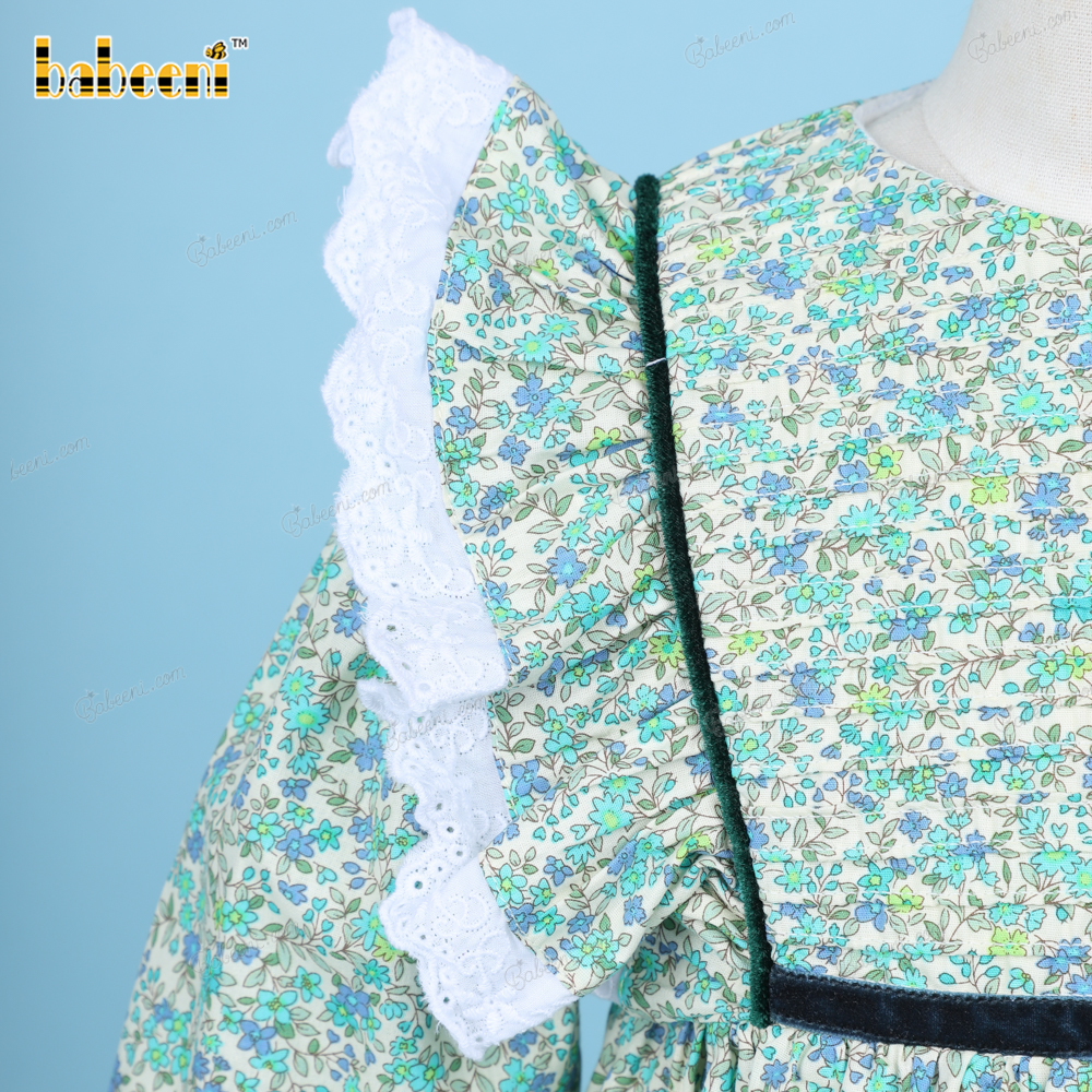 Feature: Green floral dress with cute butterfly neck and mallard green accent for your baby girl.