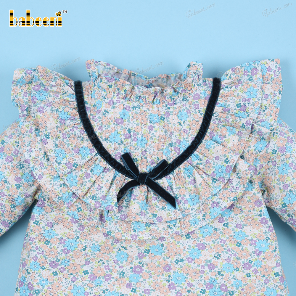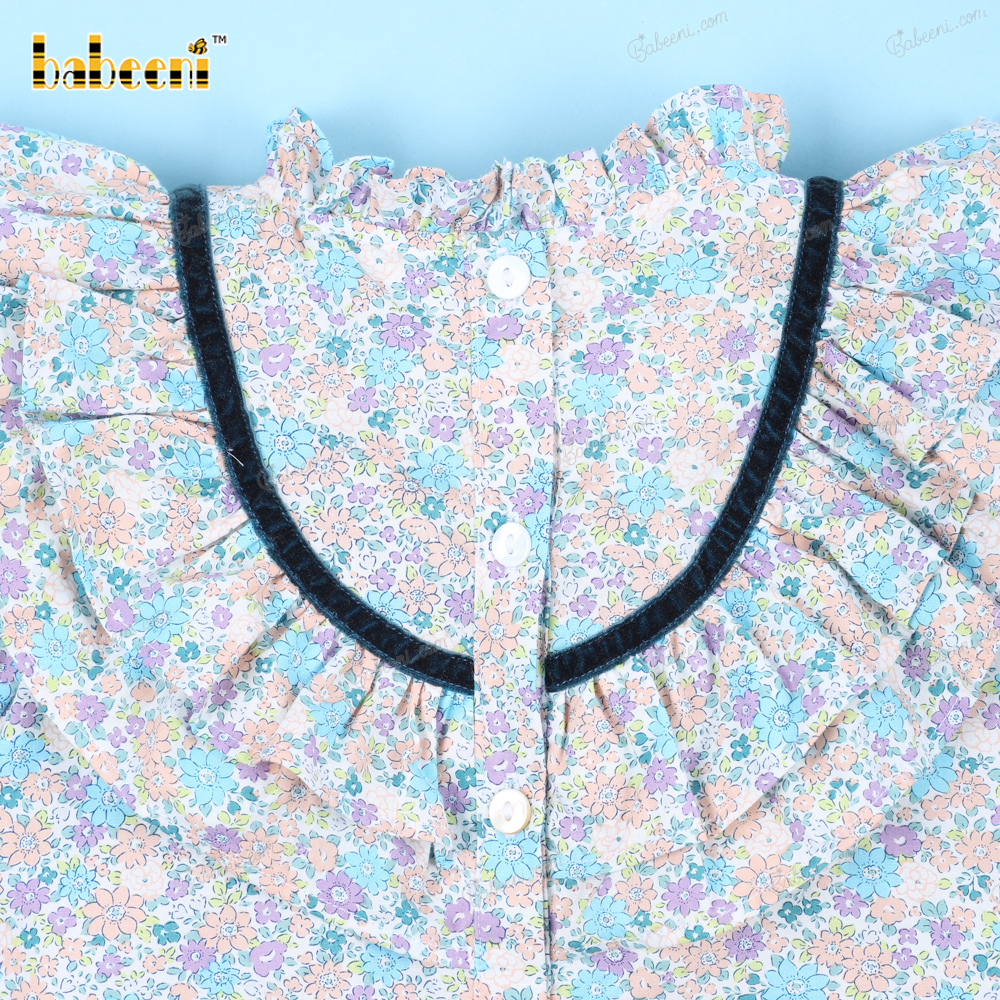 Feature: Girl shirt floral green Mallard green accent line around the neck.