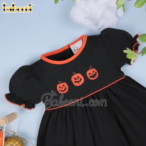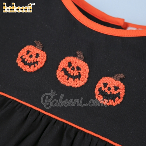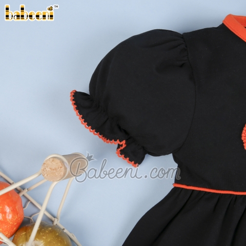 Features: Lovely Halloween dress with pumpkin French knot embroidery on the chest, orange neck & ruffle at hem of dress, orange thread zigzag on sleeves. Perfect for Halloween. Best gifts for birthday or special days.