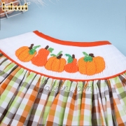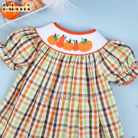 Feature: Nice dress in bishop style for little girl with pumpkin hand smocked patterns on the neck, short sleeves.