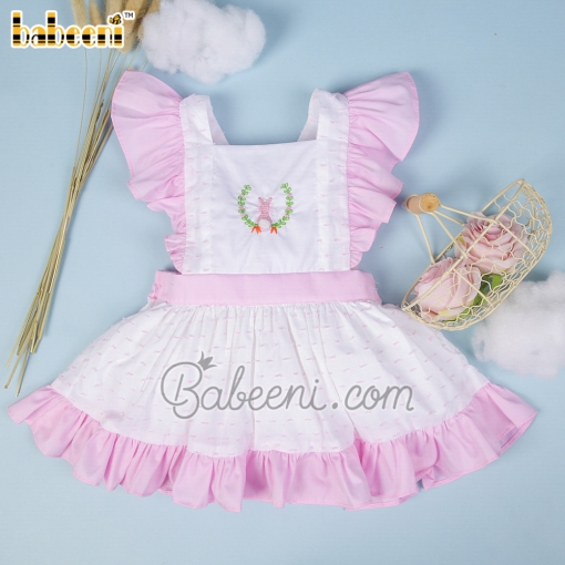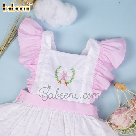 Features: Lovely baby dress for little girls with hand crochet of rabbit & hand embroidery of flowers, pink angel sleeves, ruffle on bottom. Best gifts for Easter or special days.