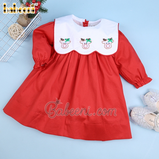 Feature: Nice dress for baby girls on Christmas with reindeer hand embroidery patterns on a large white bib, ribbon on the reindeers, long sleeves. Perfect for Christmas