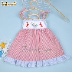 Lovely red striped girl dress with smocked shrimp and boat - BB1784A