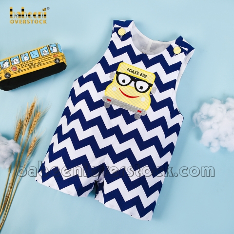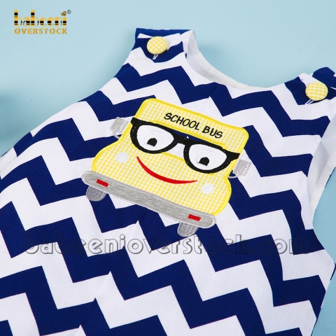 Feature: Lovely boy jon jon with School bus applique on the chest, buttons on the shoulder