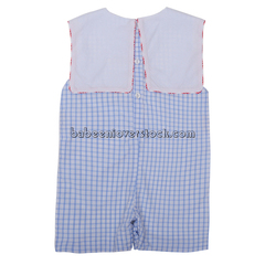 Feature:Nice boy shortall for back to school with school stationery hand embroidered patterns on large square collar. Crotch snaps.