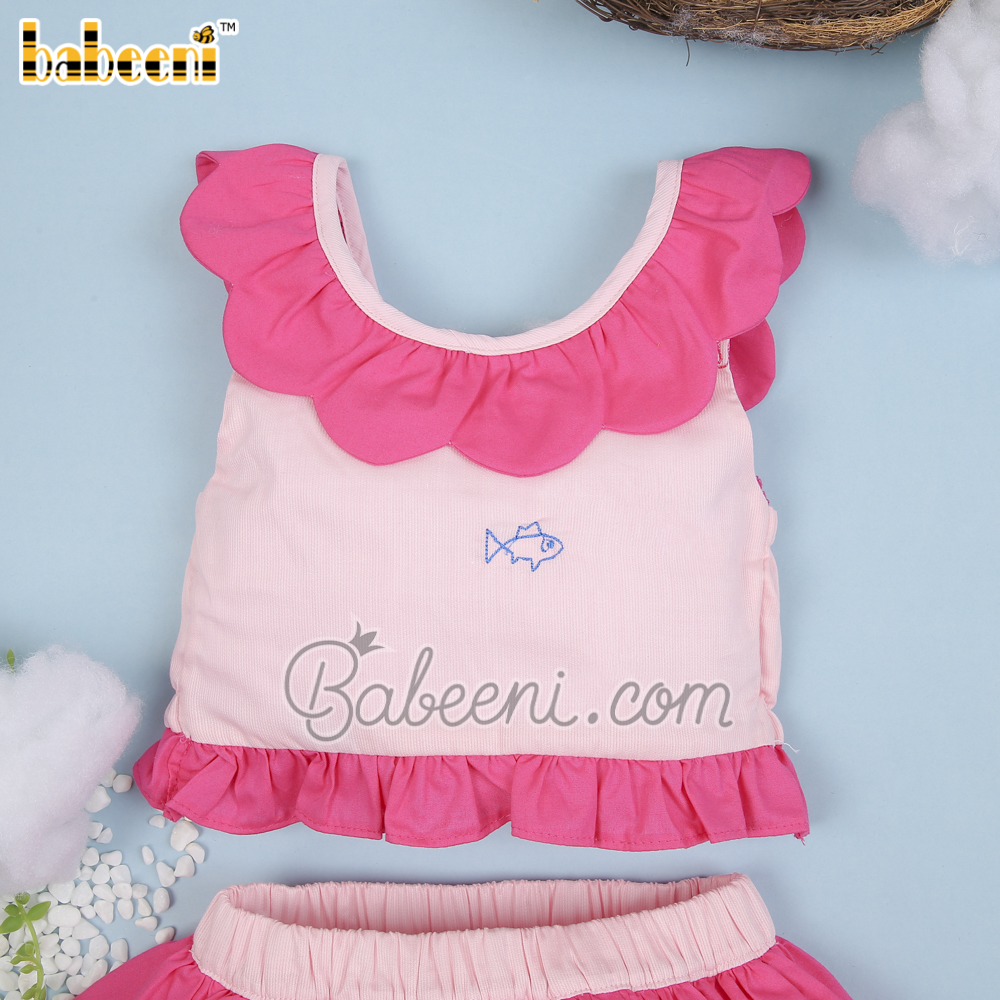 Feature:Pretty two piece swimwear for little girl with crab, fish and octopus machine embroidery patterns, elastic waistband