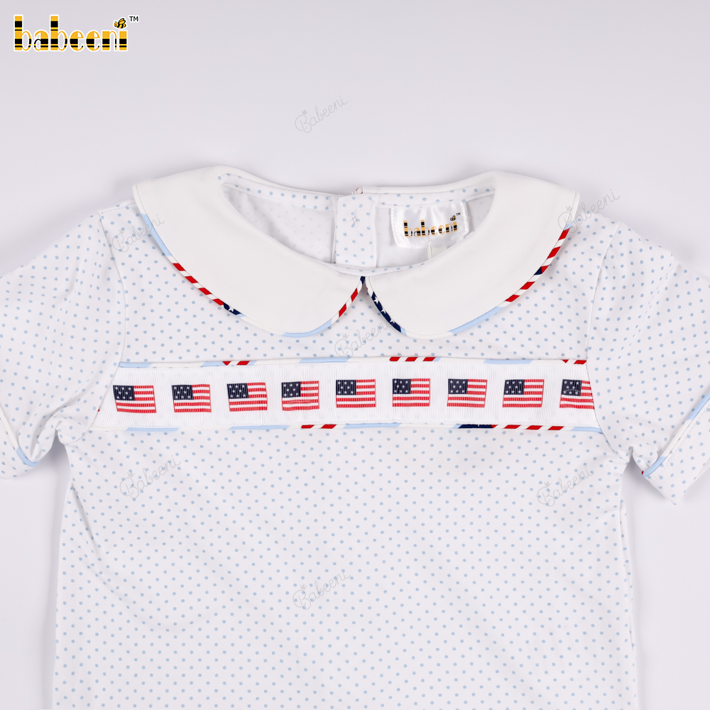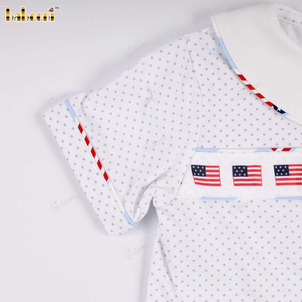 Material: American flag patterned fabric + blue striped pants with American flag print