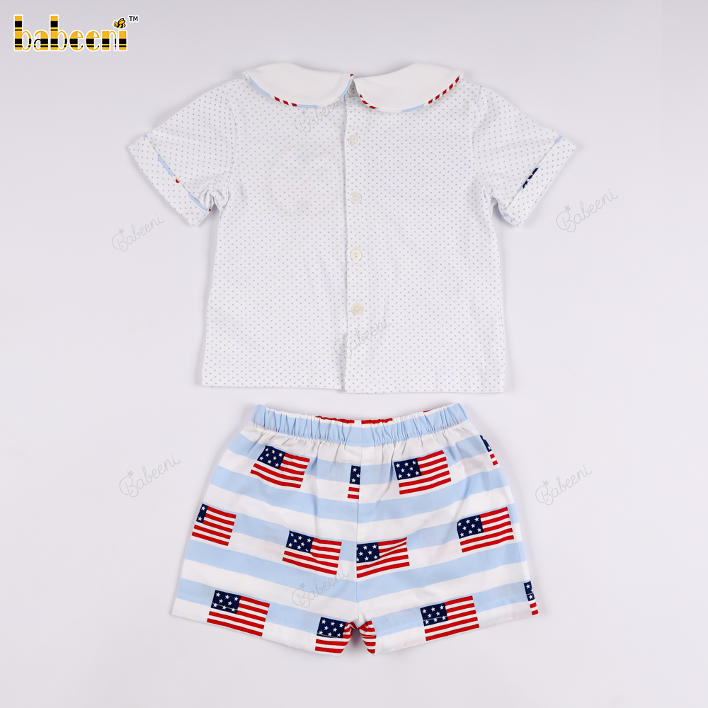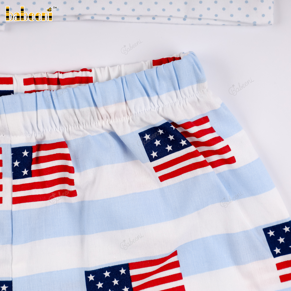 Set includes a crew neck t-shirt and shorts with an American flag print.- BB3578