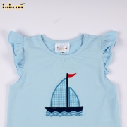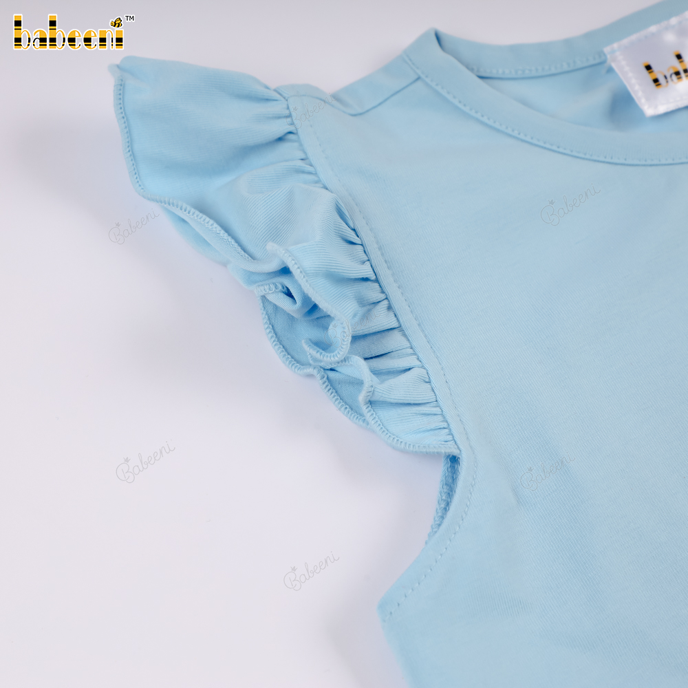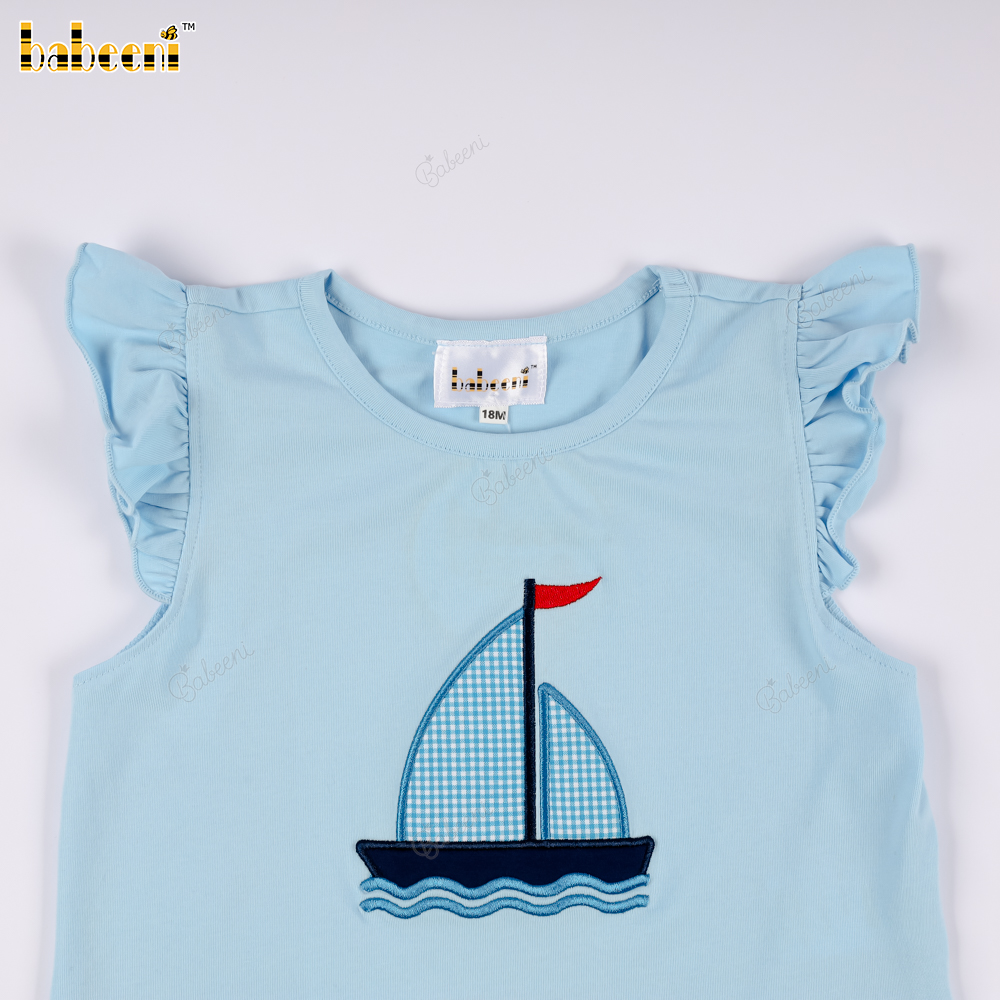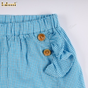 Feature: This summery outfit features a light blue t-shirt with an eye-catching embroidered sailboat design. The sleeves are designed with pretty ruffles, adding a feminine and cute touch. The blue checkered shorts, with delicate wooden buttons on the sides, create a look that is both energetic and elegant. Perfect for outings, walks, or birthday parties.